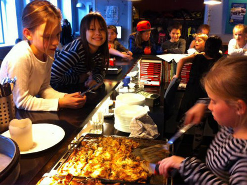 Når de unge starter i Juniorklubben i 6. klasse, arbejder vi videre med, at give dem en god madkultur. De to dage hvor Juniorklubben har åbent til kl. 21, er der mulighed for at spise aftensmad sammen. De unge har selv stor indflydelse på, hvilken mad de skal lave. I samarbejde med en pædagog tilrettelægger de unge menuen, laver en indkøbsliste, køber ind og tilbereder måltidet. Vi har for øje, at forskellige grupper får lov til at lave maden og at den er sund og varieret. De laver også en liste over, hvem der vil tilmeldes aktiviteten. Der er sidste tilmelding til aftensmad kl. 16.00.