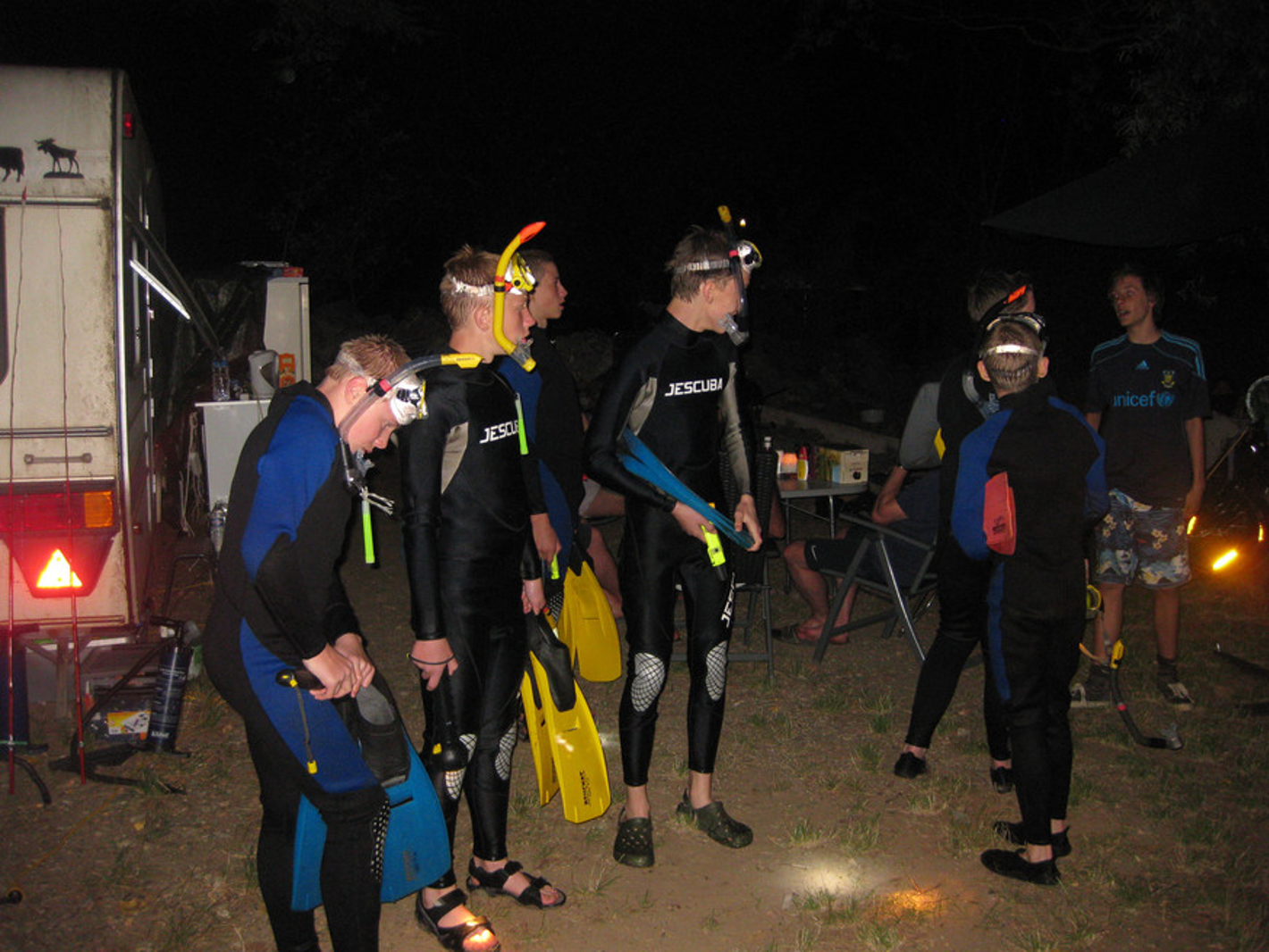 Tirsdag aften. Rikke var ude med første hold på nat dykning i floden. Sverri, Samuel, Frederik, Kian, Phillip og Johan kom i land ved 23 tiden efter en time i floden med selskab af kæmpe hajer, meterlange elektriske ål og tonstunge giftige frøer….uuhhh!